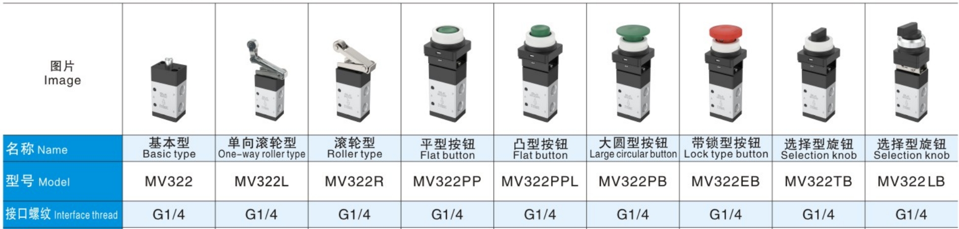 Zawór mechaniczny MV522 jest 2-pozycyjny, 5-drogowy; Zawór mechaniczny MV322 jest 2-pozycyjny, 3-drogowy.