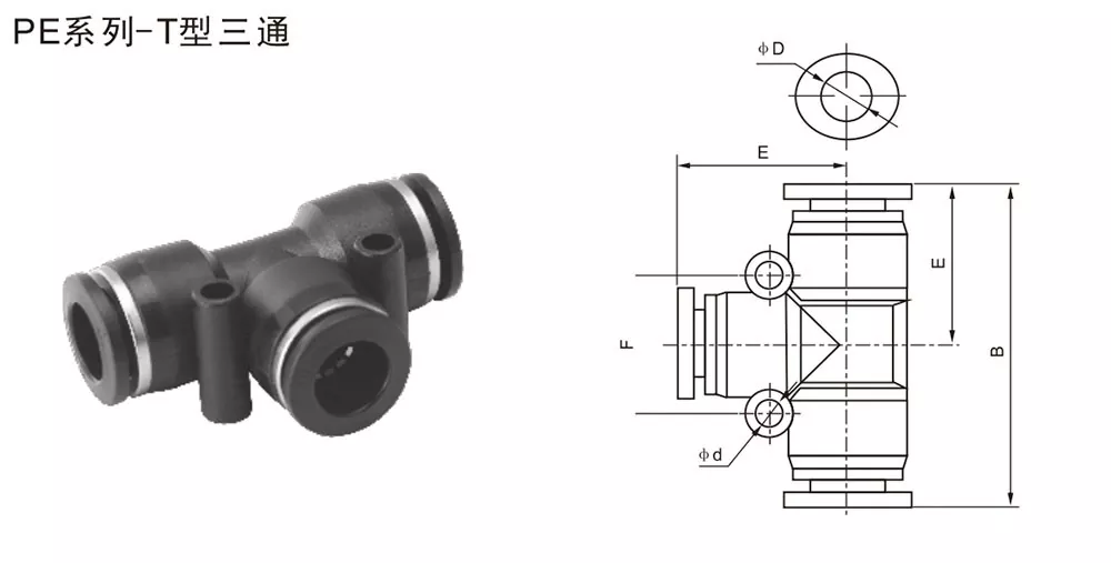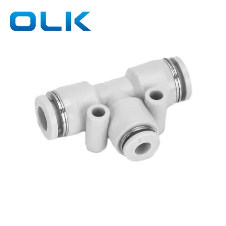 Wciskanie tee Union w PE w dopasowaniu rurowym jest dopasowanie w kształcie litery T używane do podziału lub łączenia przepływu powietrza w układach pneumatycznych.