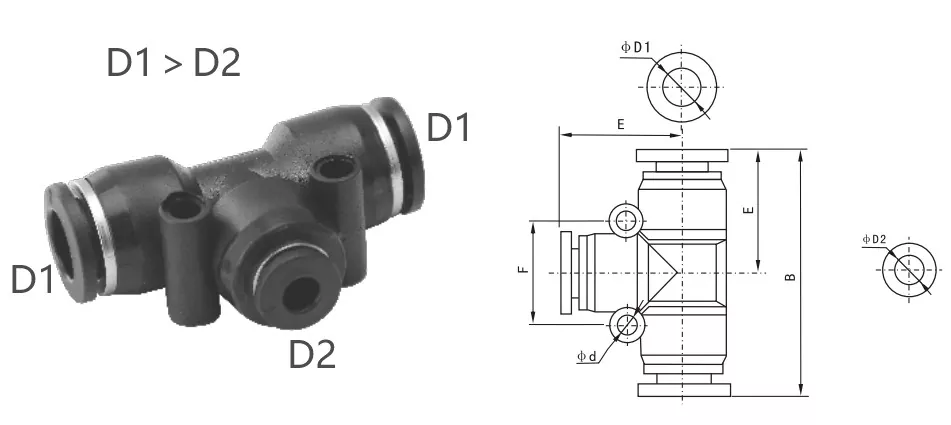 The PEG series is a Reducer Tee Union Fitting, with D1 larger than D2, designed for connecting main and branch pipes of different diameters. Związek Reduktora Związku Reduktora jest wyposażony w mały otwór montażowy dla łatwej i bezpiecznej instalacji sprzętu lub paneli, oszczędzając przestrzeń instalacyjną.