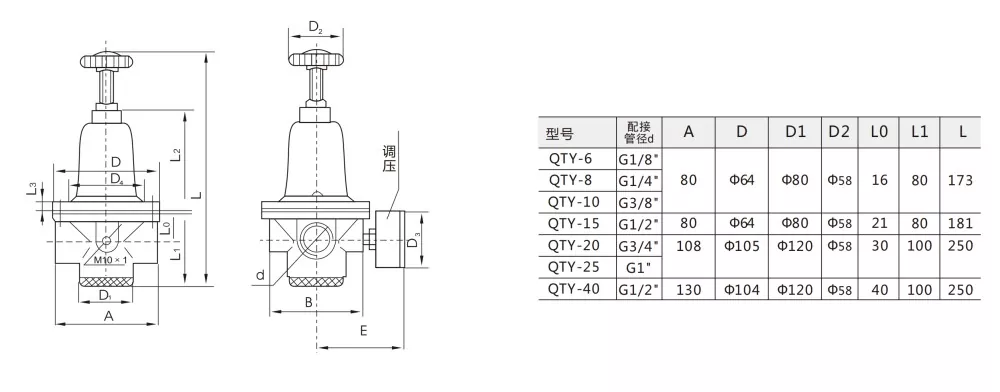 QTYH: Reduktor wysokiego ciśnienia (wysokie ciśnienie), mogący wytrzymać wyższe ciśnienie wlotowe, odpowiedni do źródeł powietrza pod wysokim ciśnieniem lub do specjalnych zastosowań przemysłowych.