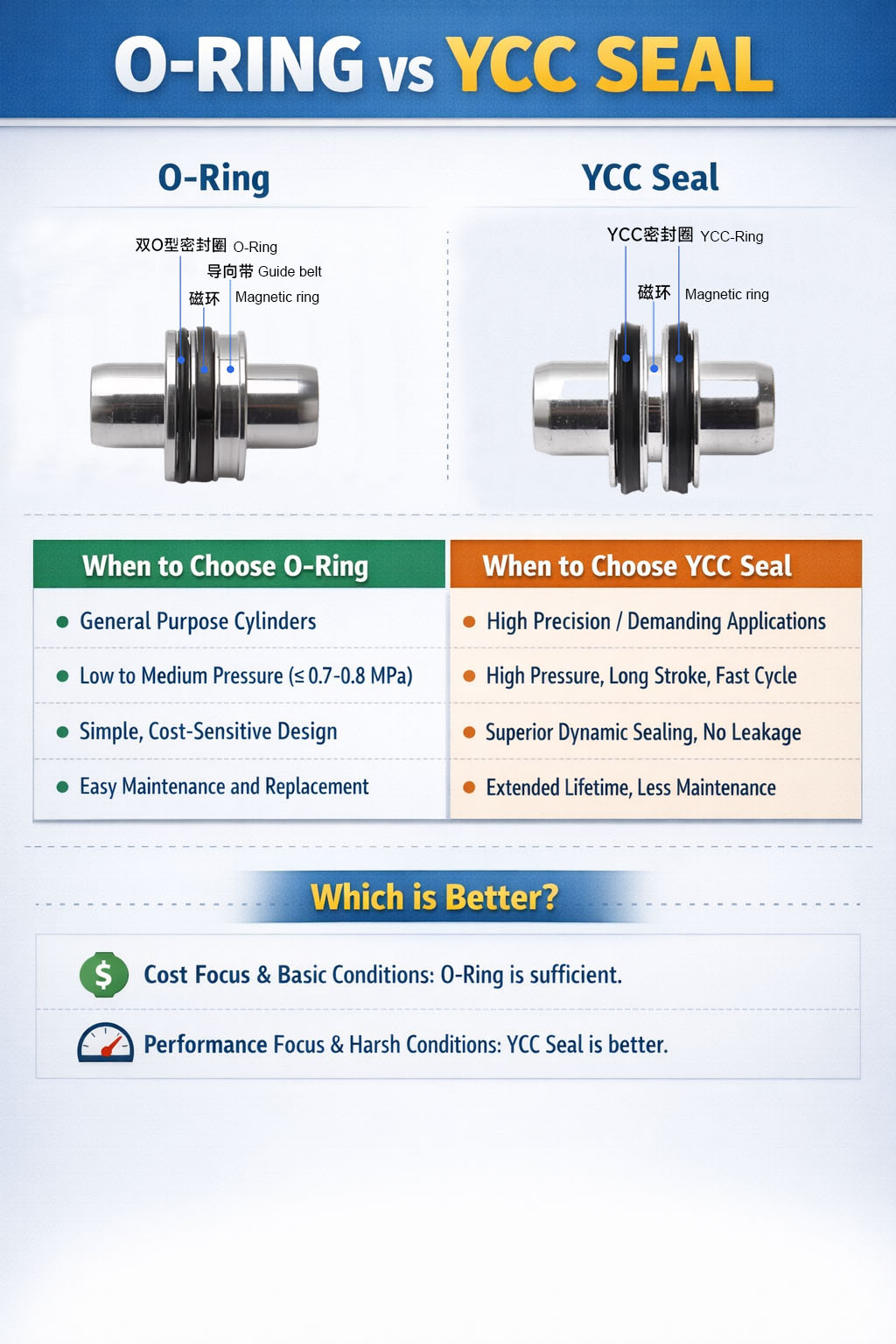 W porównaniu z tradycyjnymi pierścieniami typu O-ring, uszczelka YCC zapewnia lepsze uszczelnienie dynamiczne i odporność na zużycie, dzięki czemu cylinder może utrzymać niezawodne działanie przy zmianach ciśnienia i powtarzających się cyklach. To znacznie zmniejsza wczesne wycieki i wydłuża okresy międzyobsługowe.