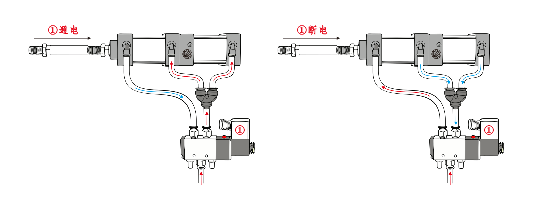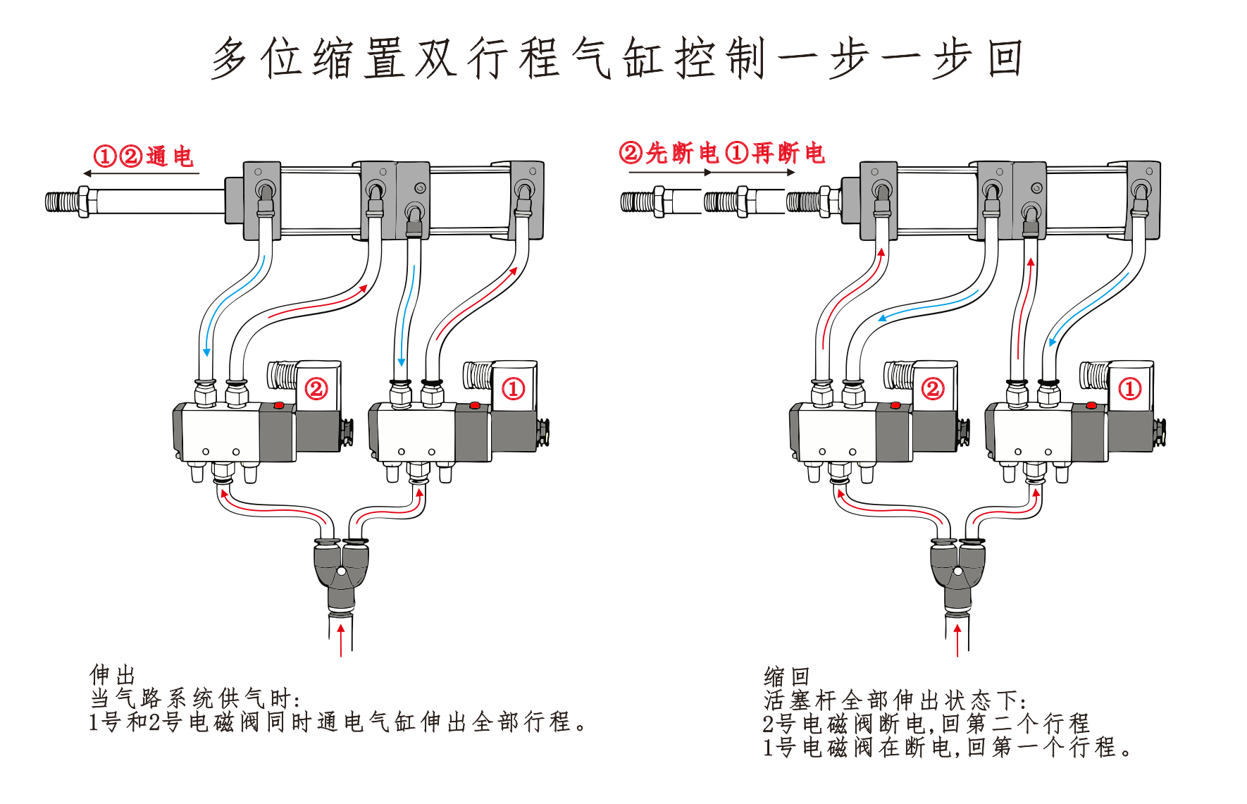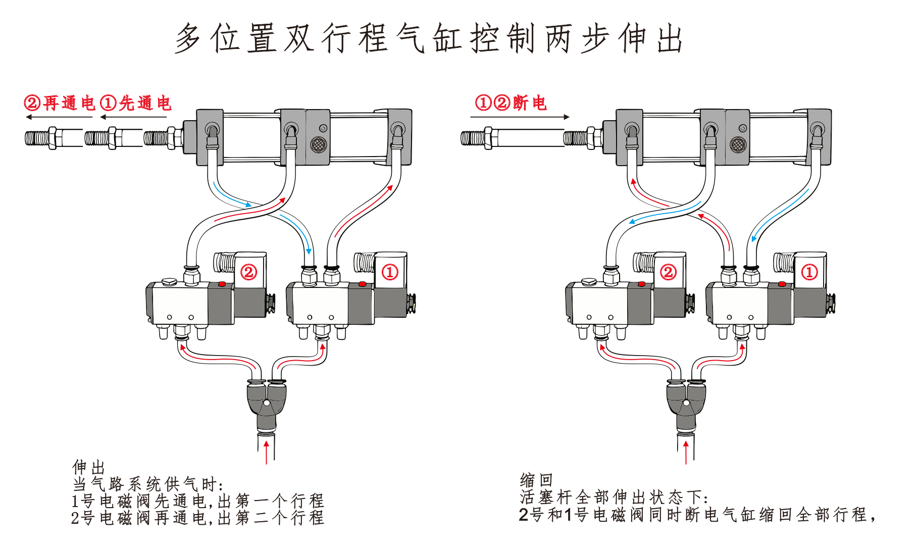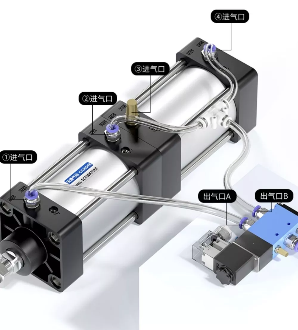 Wlot powietrza do cylindra ① jest podłączony do portu A zaworu elektromagnetycznego, a wlot powietrza do cylindra ④ jest podłączony szeregowo do portu B zaworu elektromagnetycznego. Wlot powietrza Cylindra③ jest podłączony do tłumika. Kiedy port A elektrozaworu jest zasilany, siłowniki pozostają w pozycji wycofanej. Po zasileniu portu B cylindry zaczynają działać.