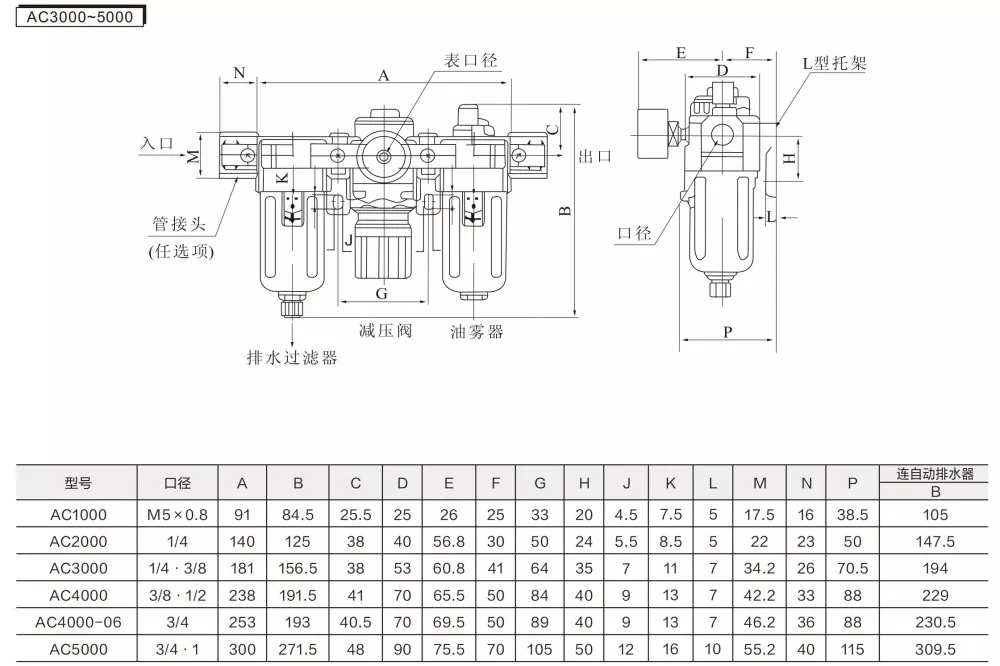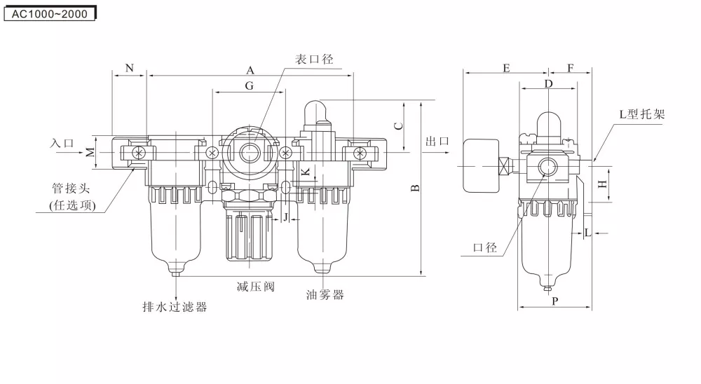 AF (filtr powietrza) + AR (zawór regulacji ciśnienia) + AL (smarownica mgłą olejową) = jednostka potrójna AC