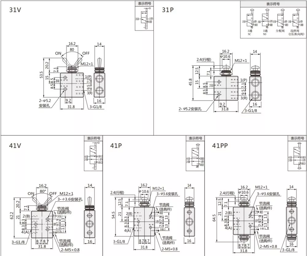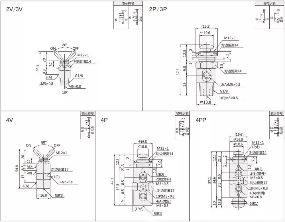 Zawór przełączający serii TAC ma 2 pozycje 2-drogowe, 2 pozycje 3-drogowe i 2 pozycje 5-drogowe. Można wybrać różne typy dźwigni i dwa typy gwintów: M5, G1/8.